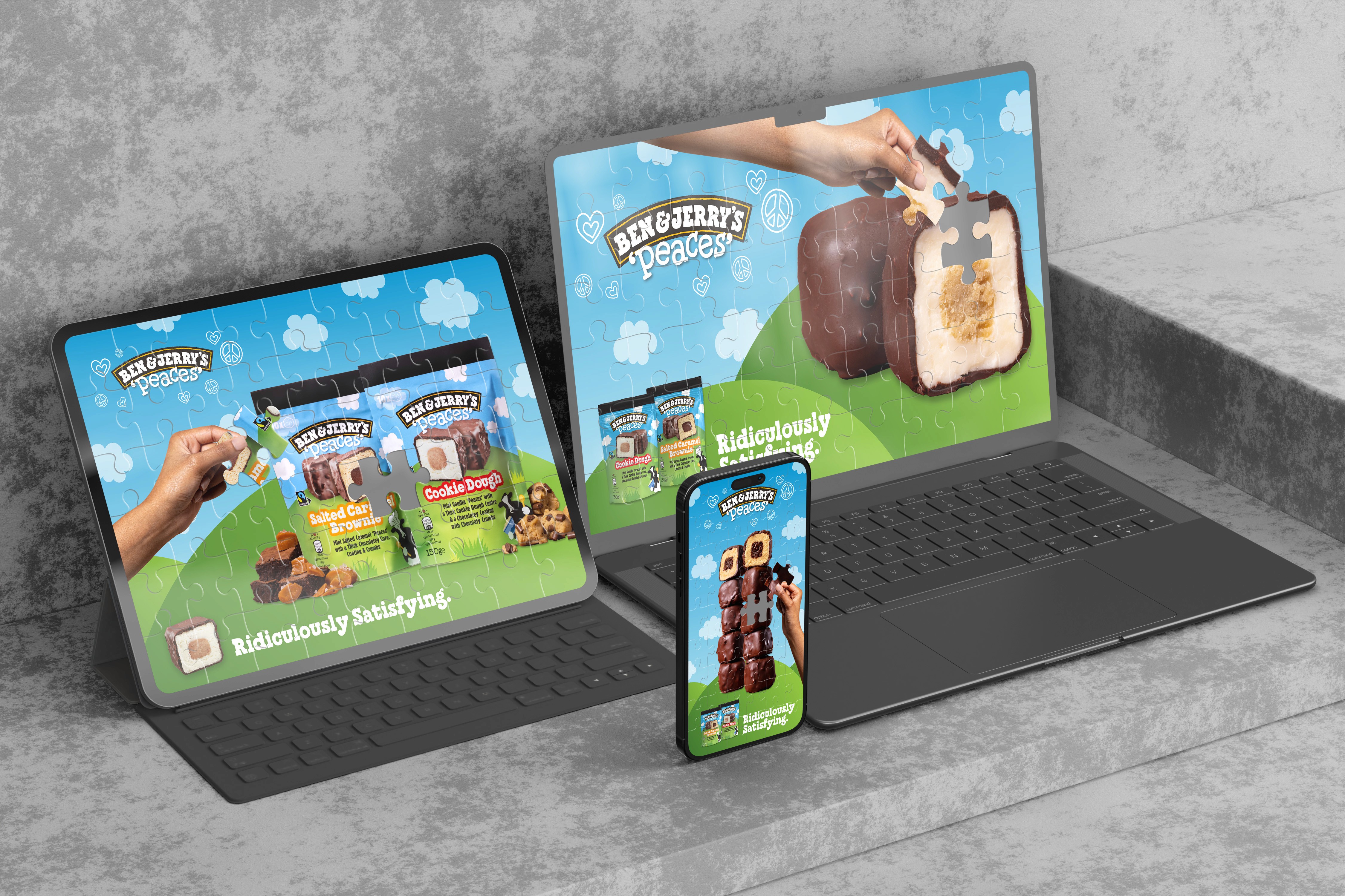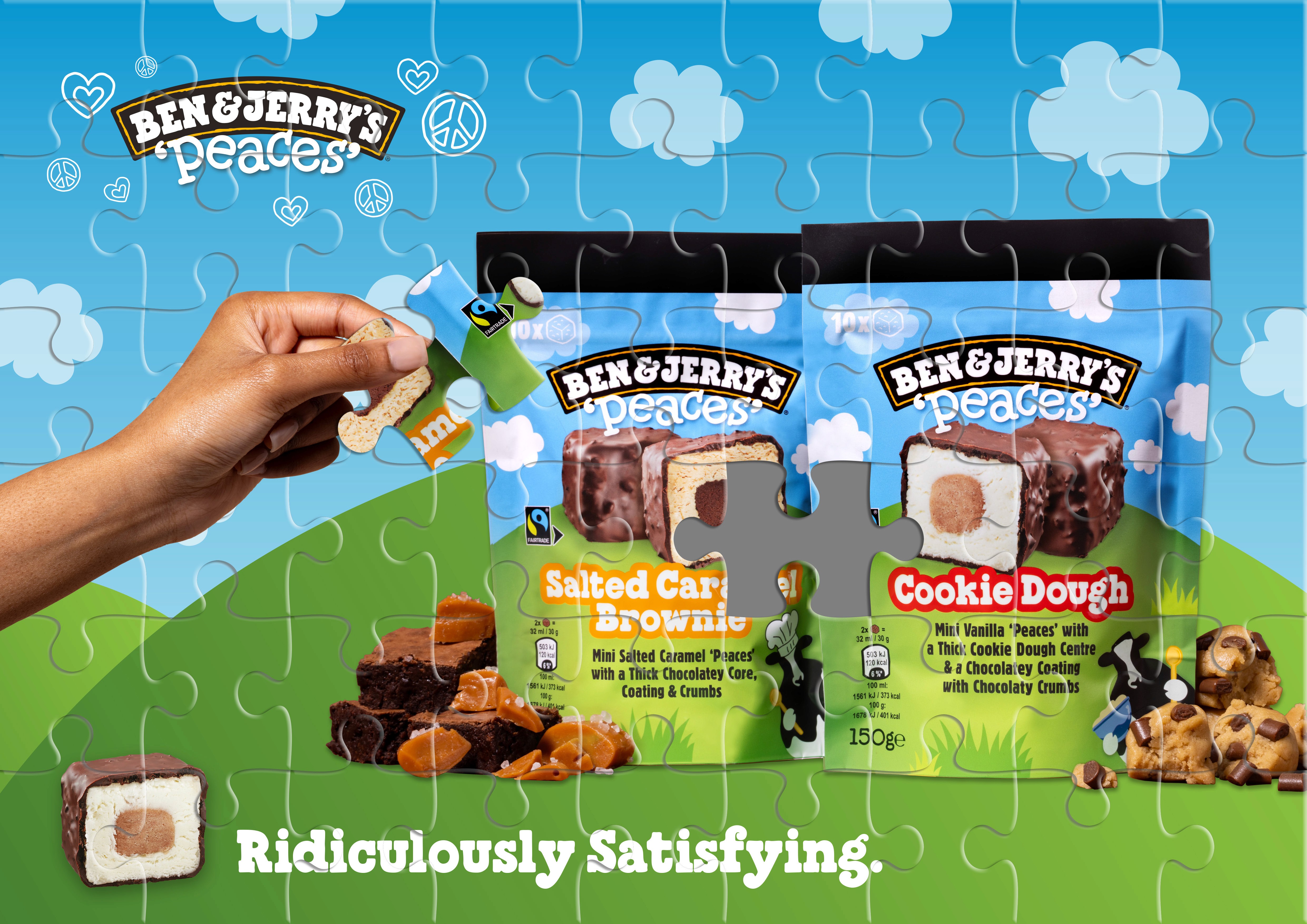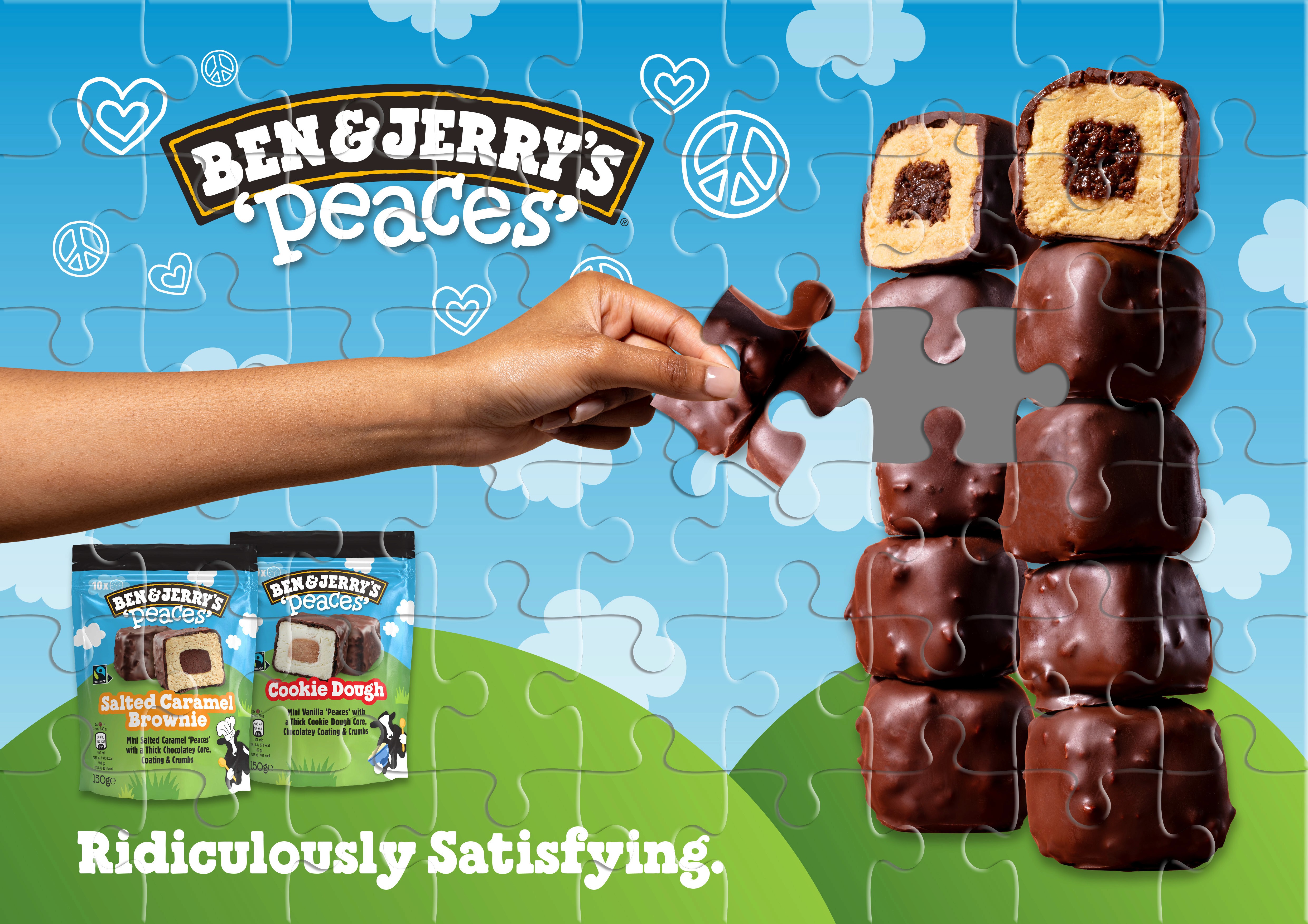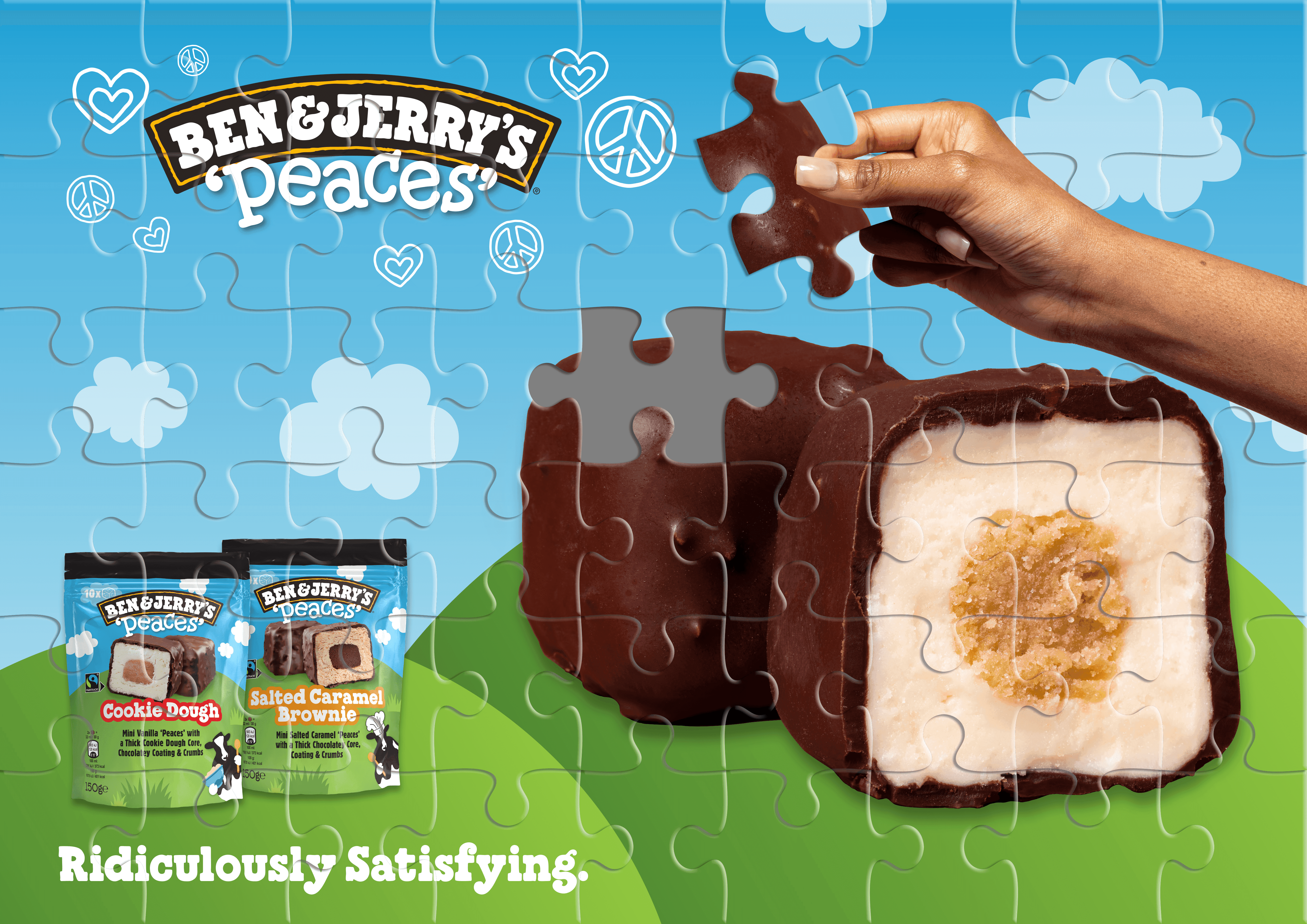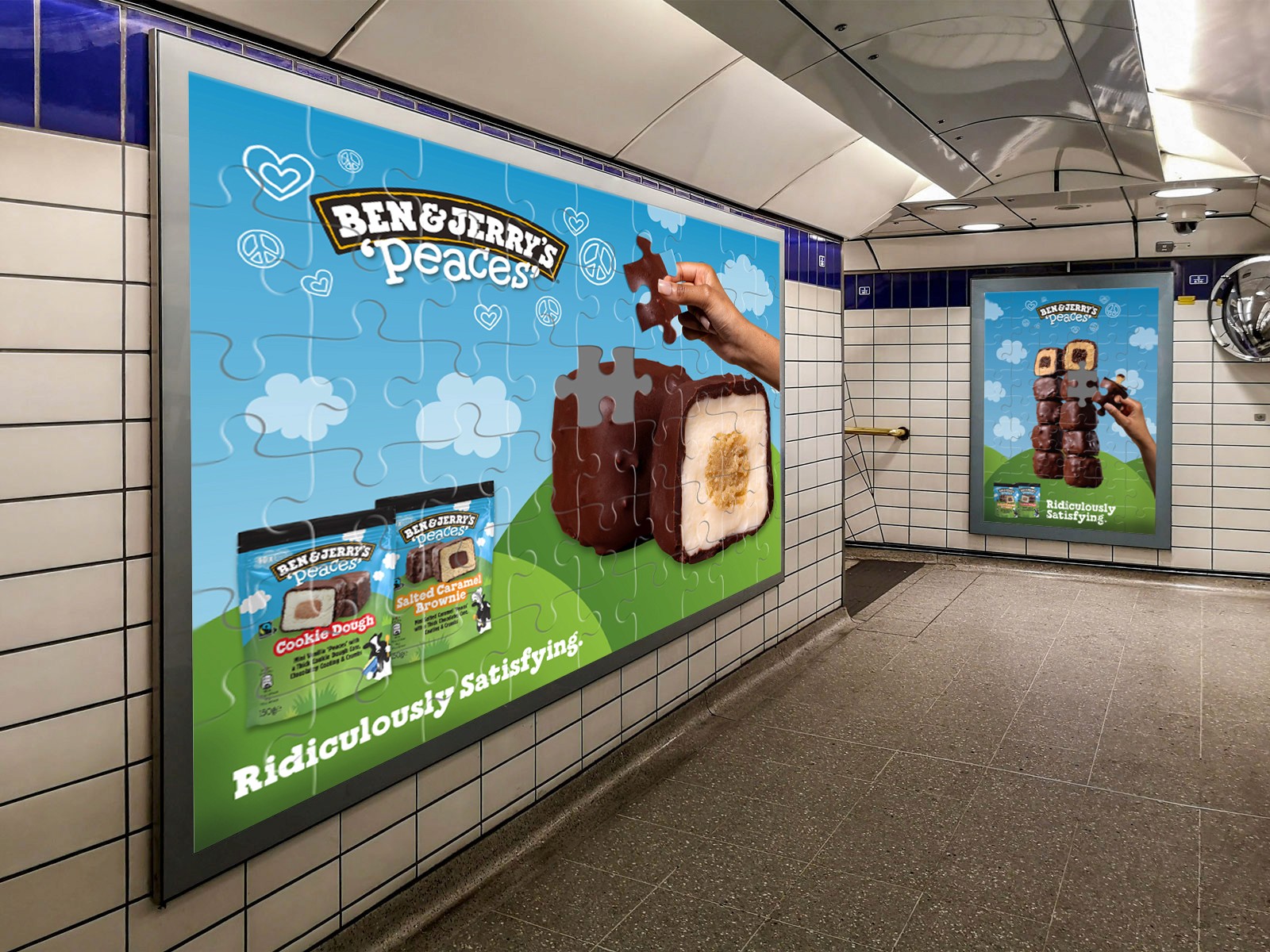 The renowned ice cream company, Ben & Jerry's, known for its innovative flavours and playful brand identity. Myself, alongside the design team at Uncovered Group, were tasked to create the key visual design for their new ‘Peaces’ product. They wanted the design to reflect all things ‘Ridiculously Satisfying’. As a team, we created a jigsaw puzzle concept wherein the key visual could be used both for digital and OOH. The key visual shows the final piece of the puzzle about to be placed - reflecting the ‘Ridiculously Satisfying’ element the client asked for. The design encapsulates Ben & Jerry’s playful brand identity through their iconic green rolling hills and clouds in the sky whilst showcasing the new ‘Peaces’ product effectively.