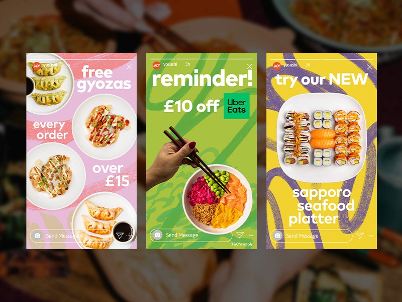 YO! Sushi is an authentic Japanese restaurant chain, known for its innovative Japanese cuisine and unique fusion dishes. Their dynamic and colourful brand identity inspired fun and innovative designs. As a retained client at Uncovered Group, I led the design for their social media content, ensuring alignment with their brand guidelines. Incorporating printed outlines of dishes and playful brush strokes, enhancing the visual appeal and brand coherence.